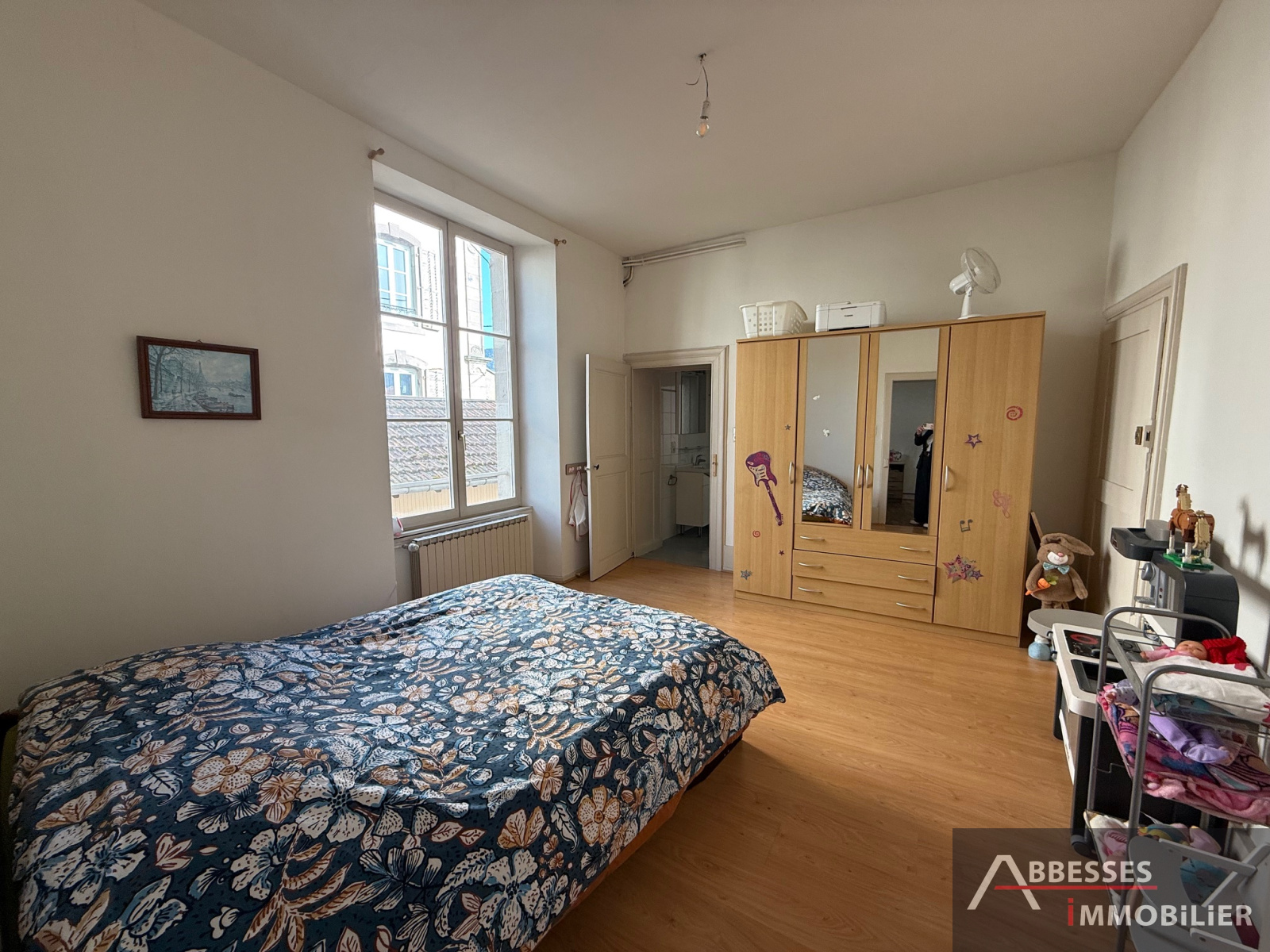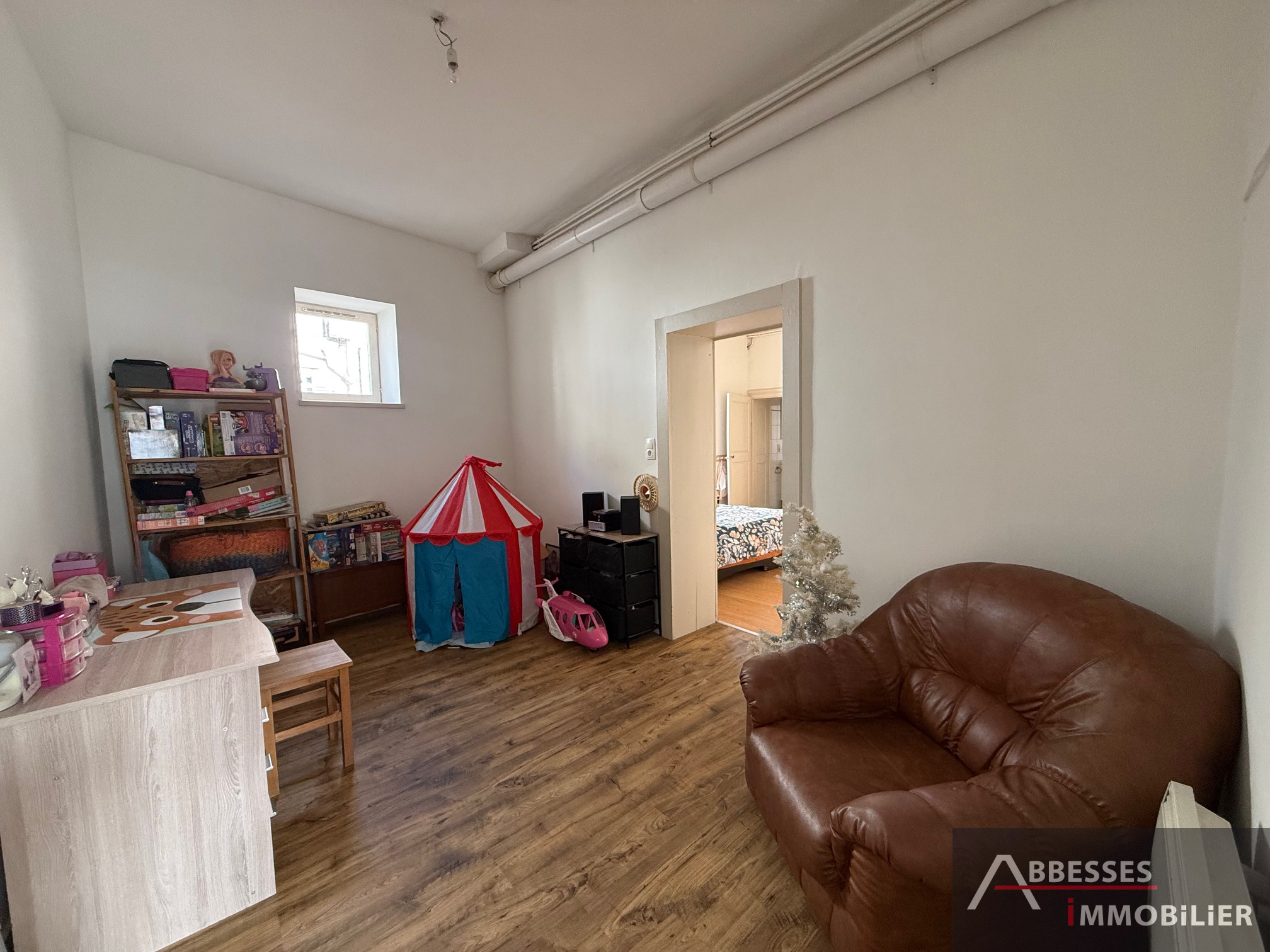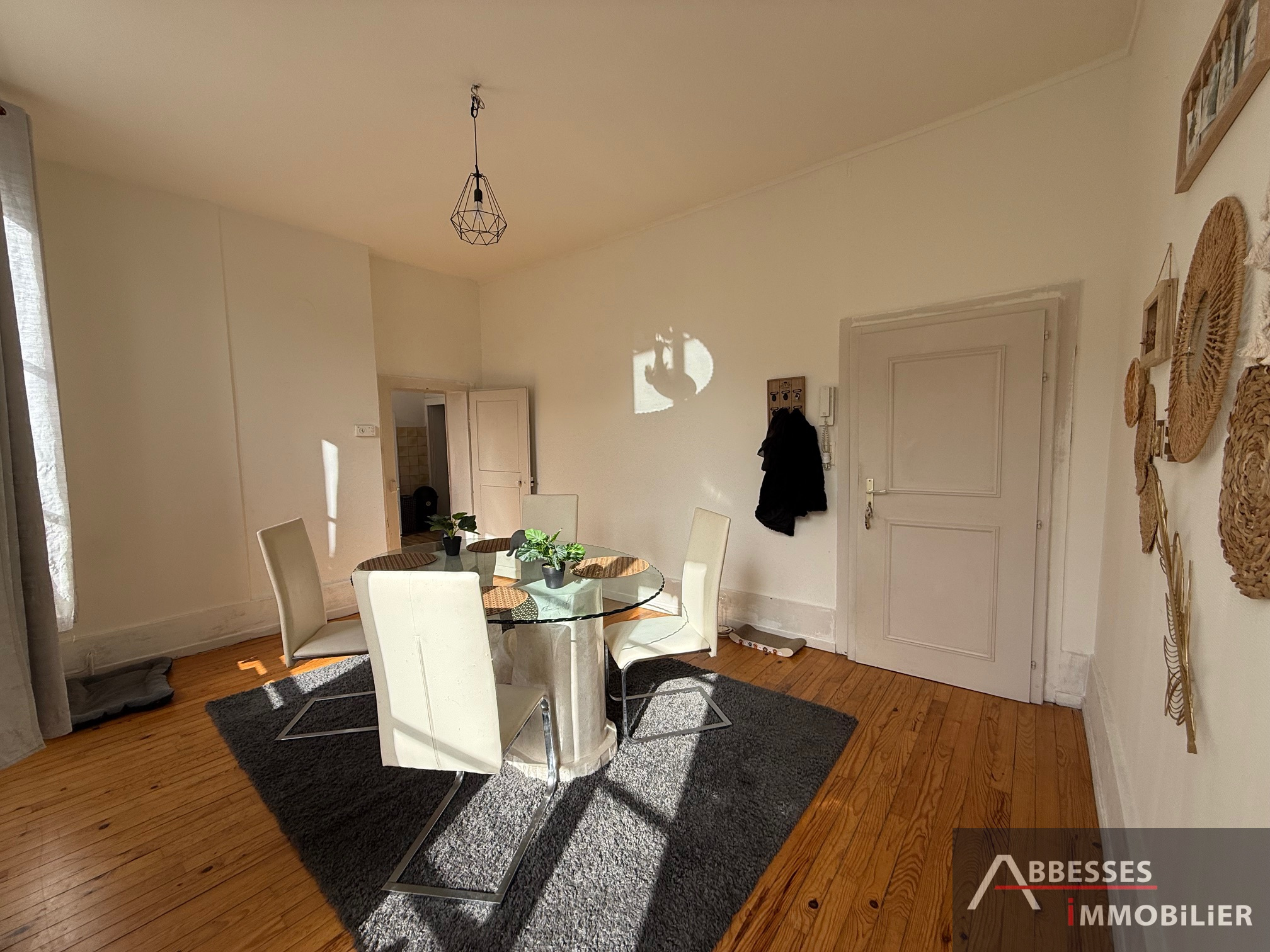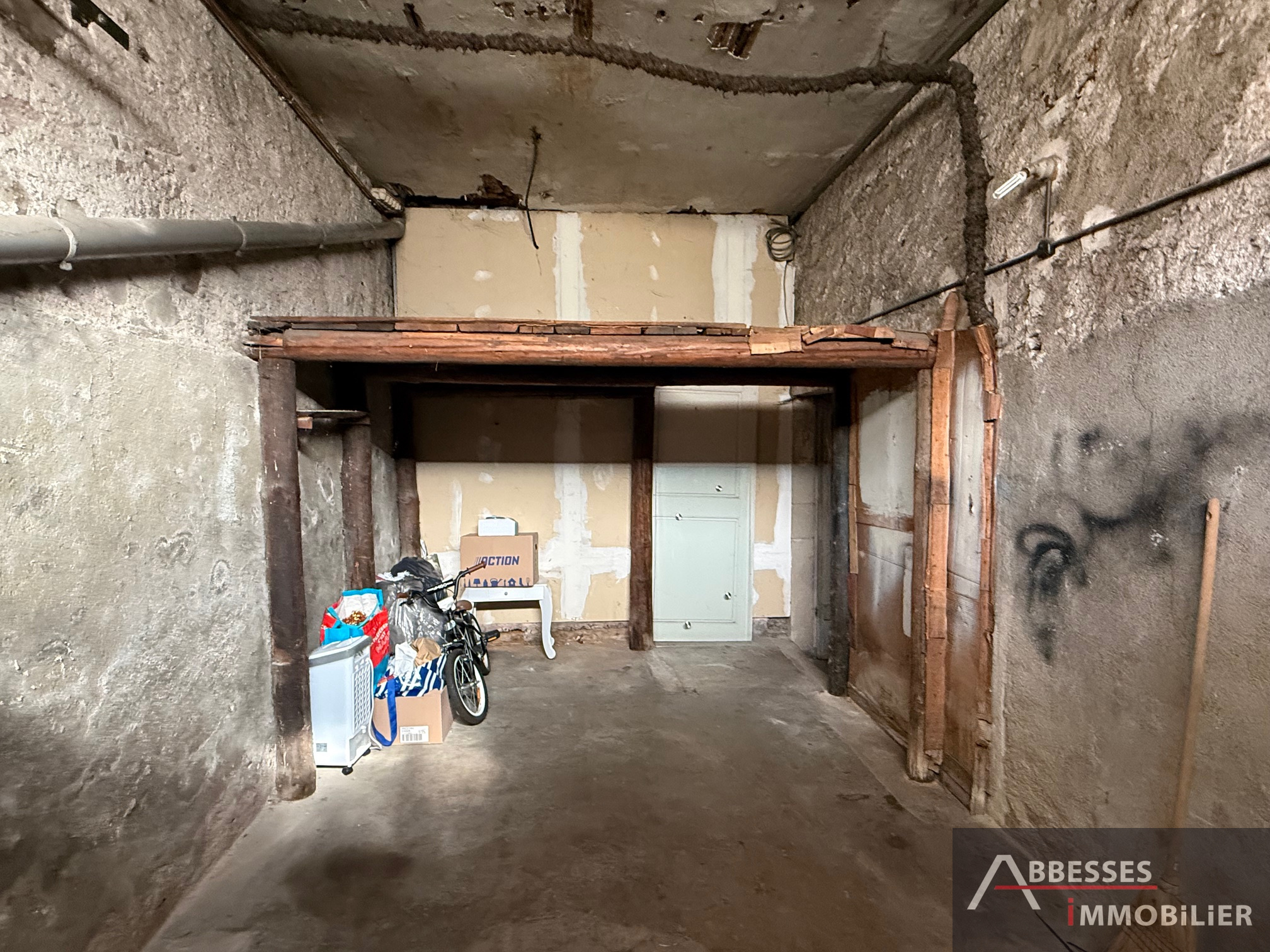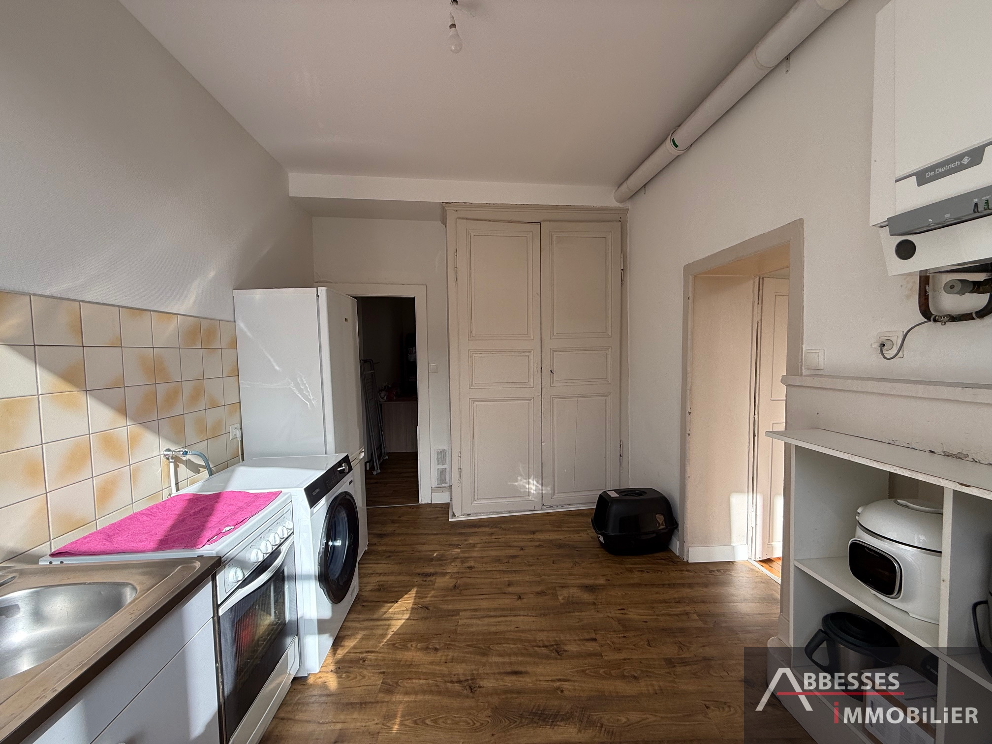 Appartement F4 situé au 1er étage comprenant : entrée, cuisine (évier), salon / séjour, 2 chambres, salle de douche avec wc, pièce annexe (bureau). Garage (moto ou stockage). Chauffage individuel gaz de ville.