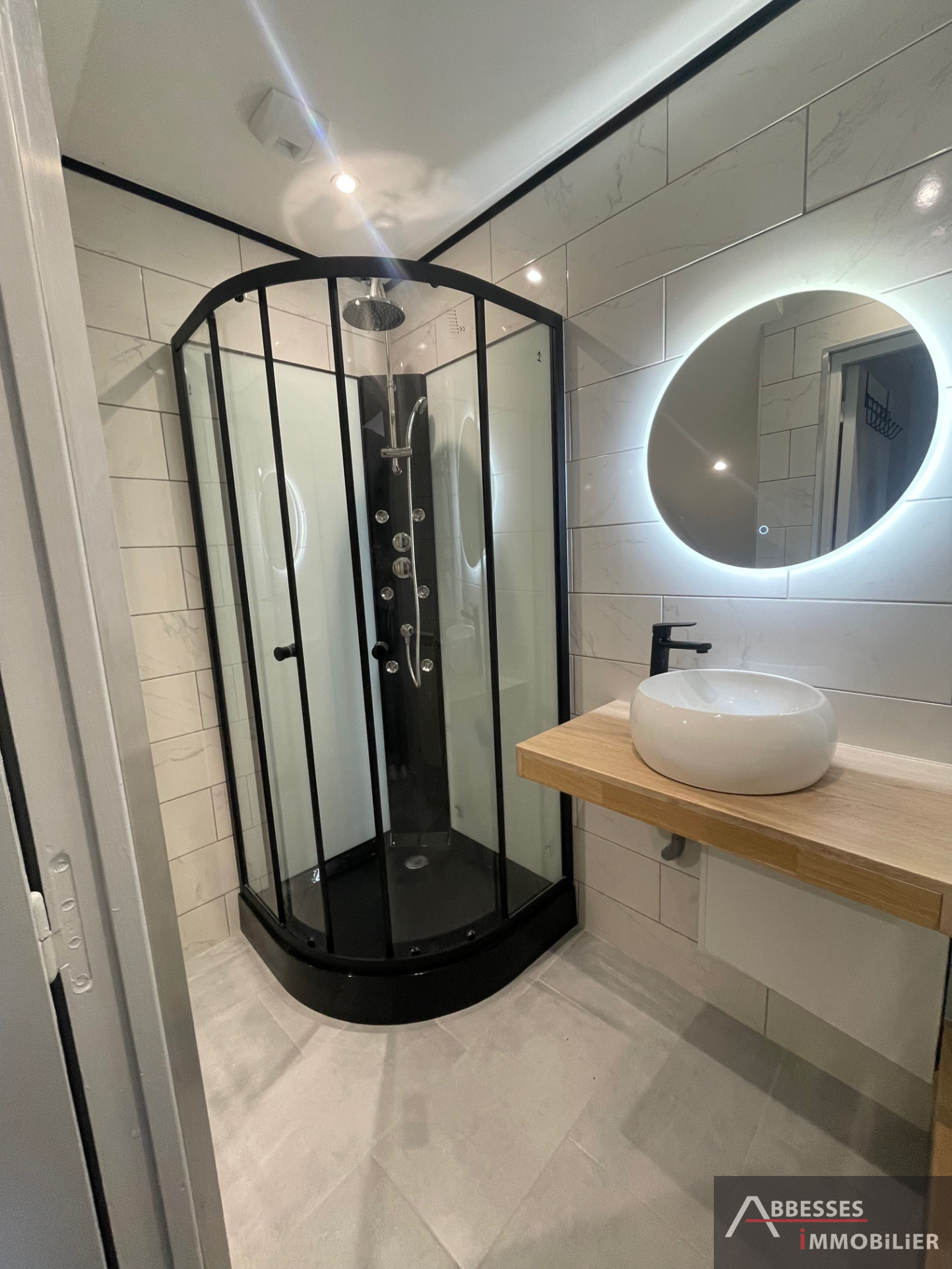 Cuisine aménagée équipée ouverte sur pièce à vivre, 2 chambres, salle de douche et wc. Terrasse dallée.