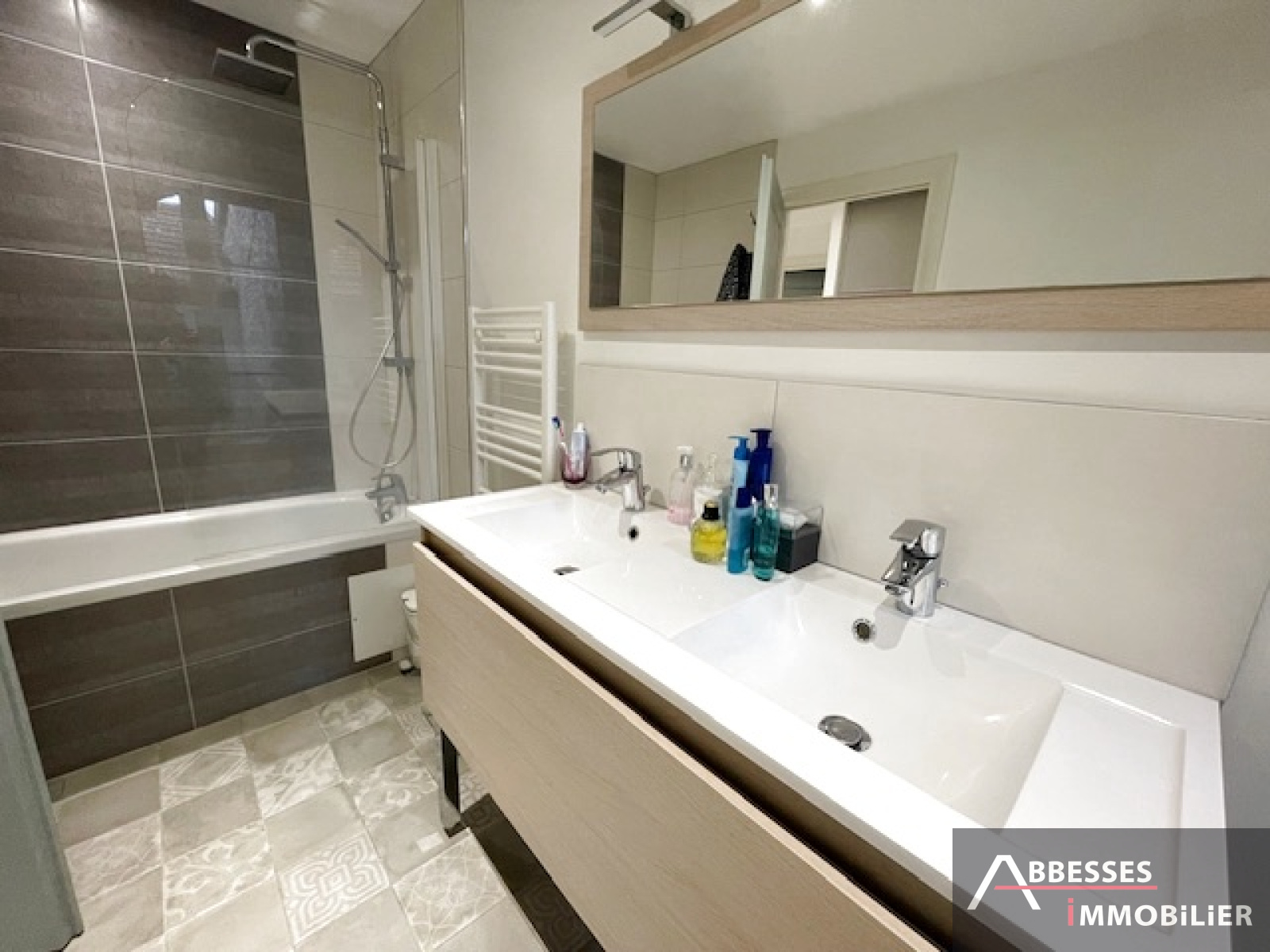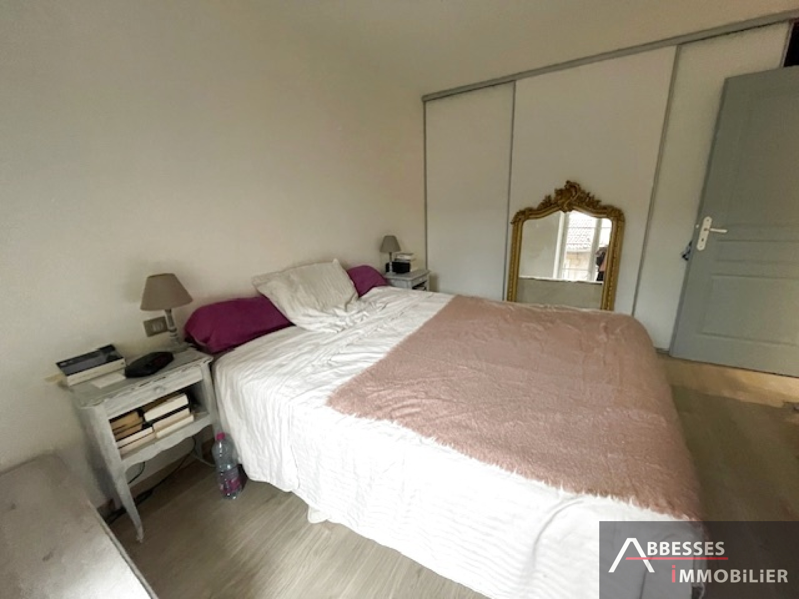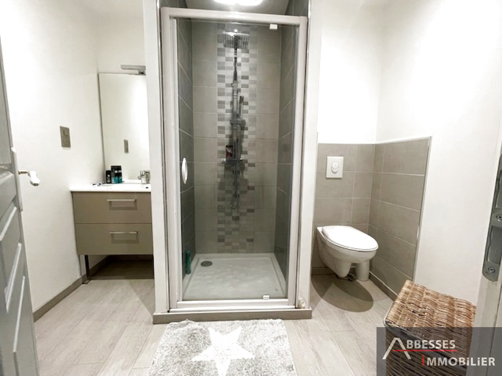 Entrée dégagement avec grand placard, cuisine équipée ouverte sur salon séjour, 1 chambre avec grand placard, salle de bain (baignoire, meuble 2 vasques), wc, cellier.