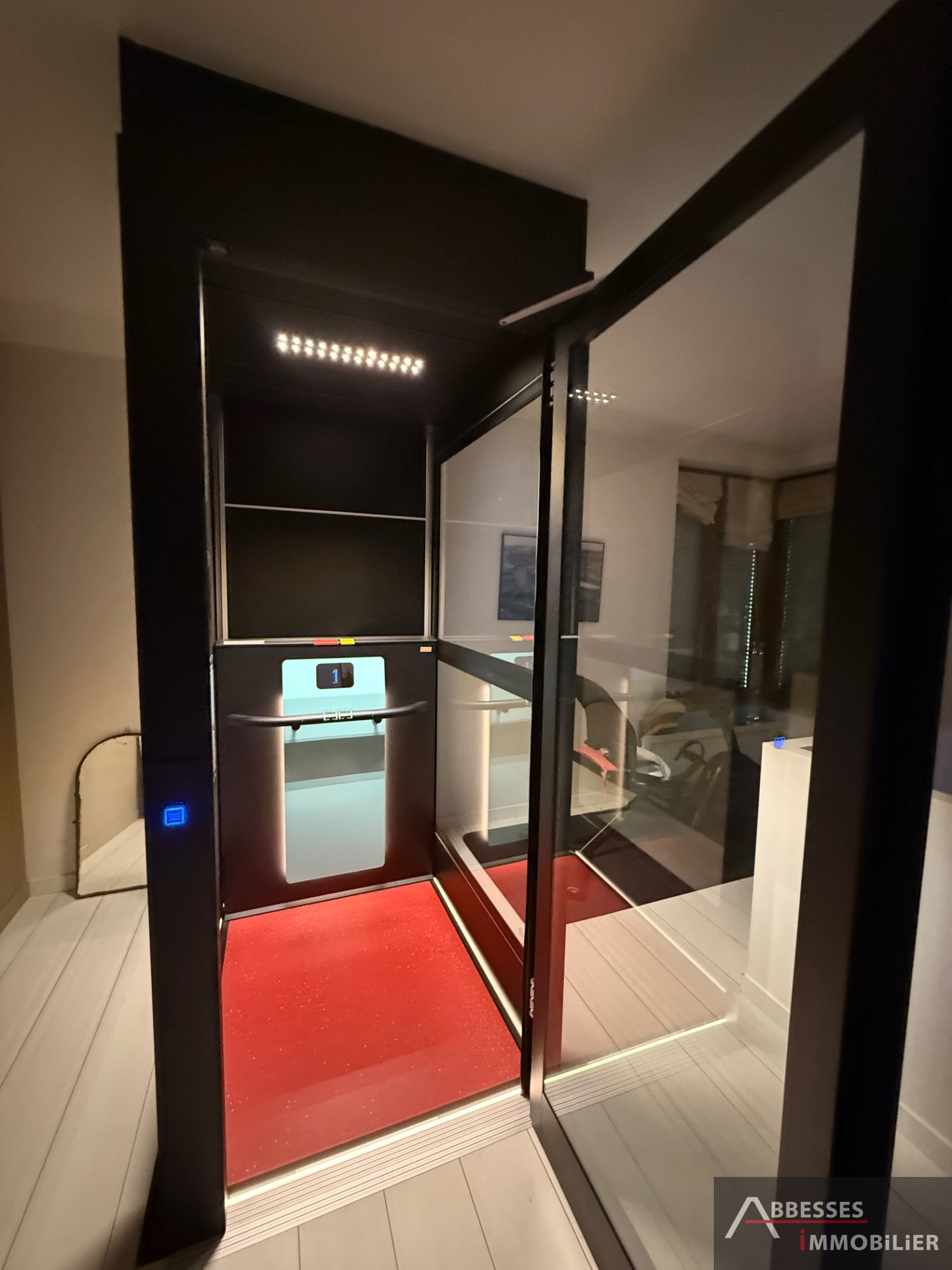 A l'étage : accès par escalier contemporain en colimaçon ou "ascenseur" (type monte-charges). Mezzanine, 2 chambres, salle de bains avec wc.