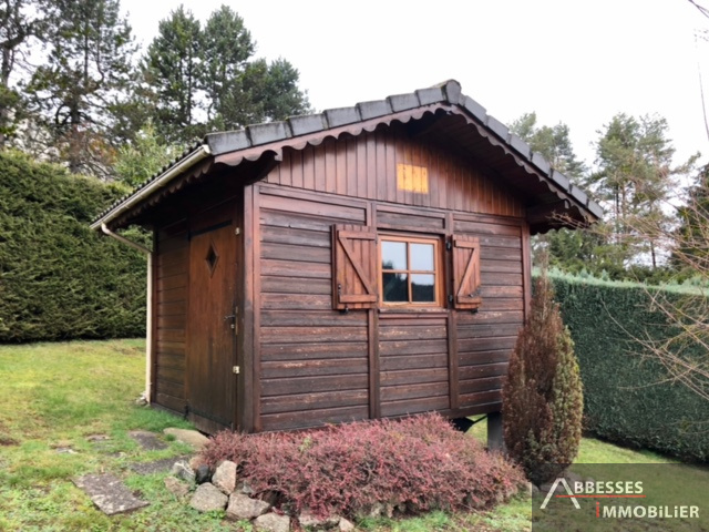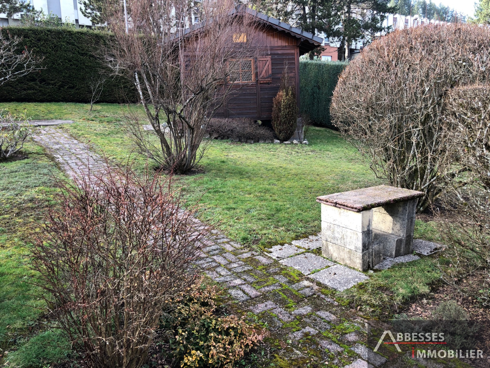 Terrain attenant clos et paysagé d'une superficie totale d'environ 529 m² avec abri de jardin en bois.
