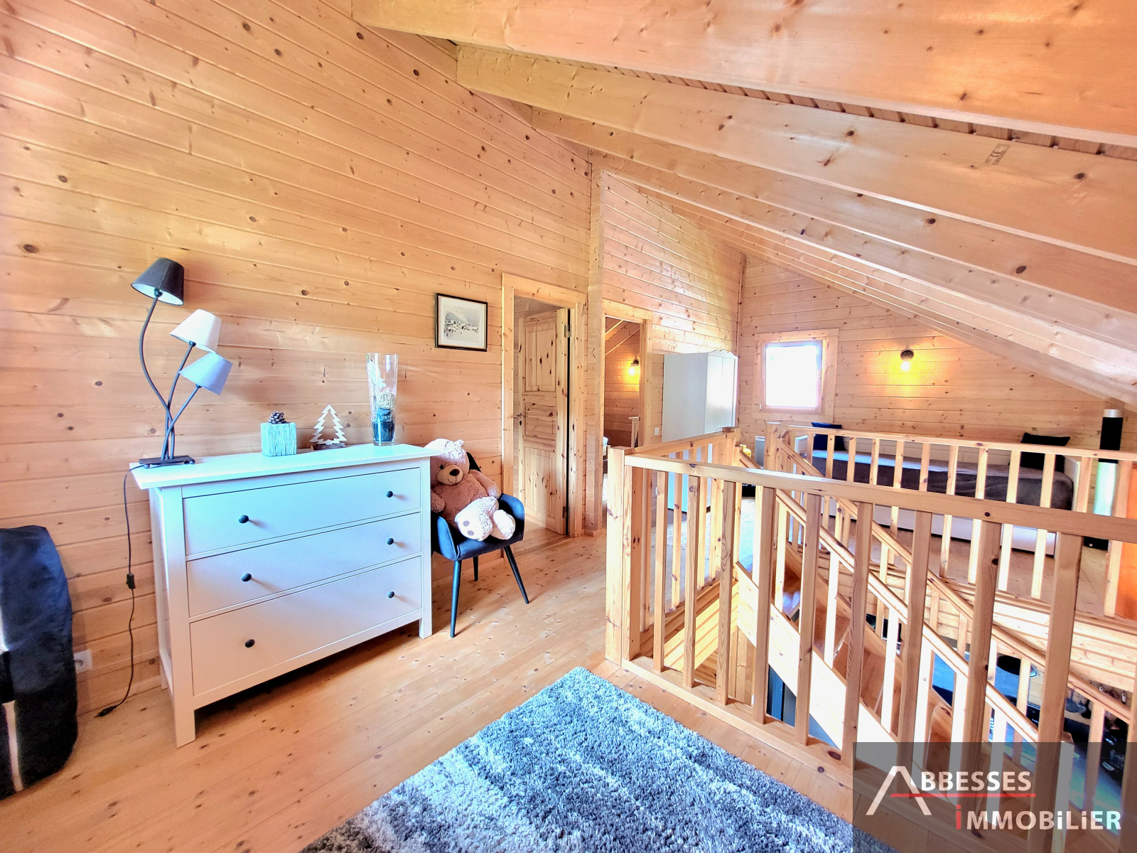 A l'étage : pallier desservant 2 chambres, mezzanine avec partie bureau + espace couchage