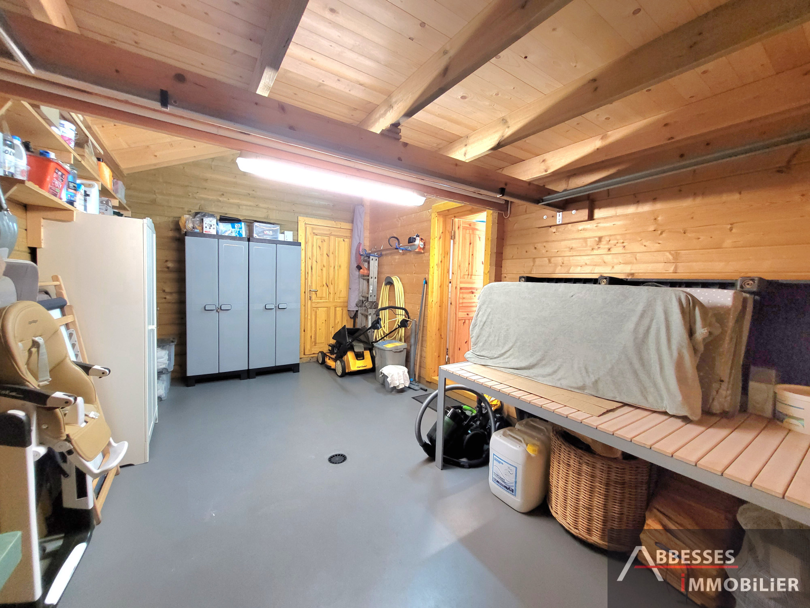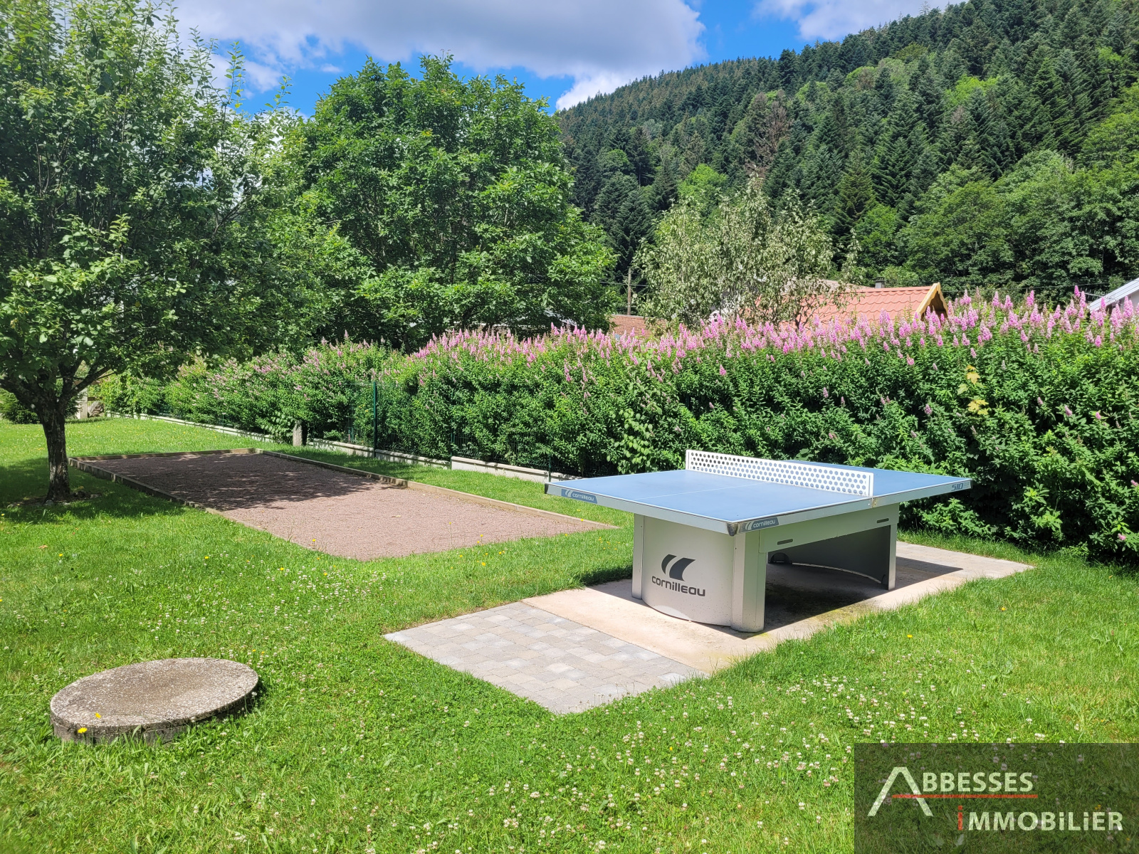 Garage. Terrain d'environ 1 079 m² cloturé et arboré avec espace jeux pour enfants + boulodrome.