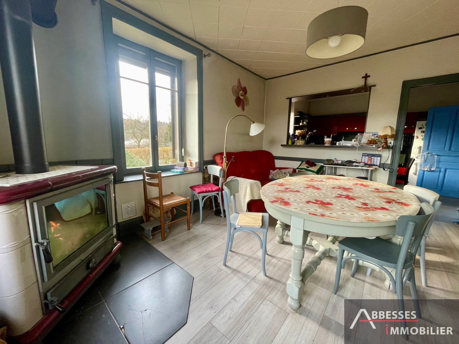 F6 composé : entrée, cuisine équipée ouverte sur salon séjour avec poêle à bois accès extérieur, salle de douche + wc, 1 pièce. À l'étage : 3 chambres, wc.