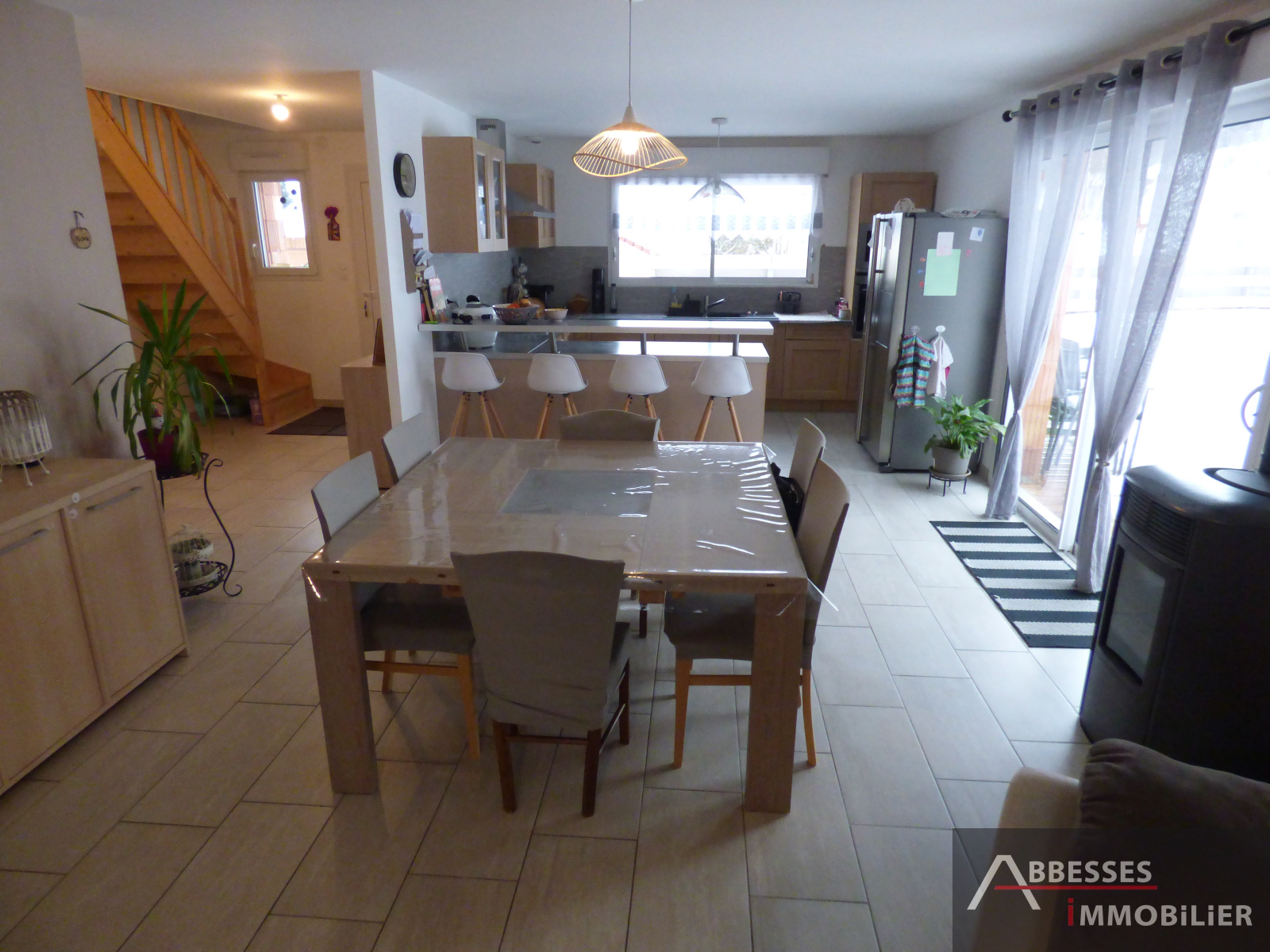 Composé : Au rez de chaussée : entrée-dégagement avec placards, jolie cuisine équipée ouverte sur salon-séjour (env 55 m²) avec poele à pellets et accès terrasses bois. Une chambre parentale avec dressing et salle de douche italienne, wc. A l'étage : vaste mezzanine (bureau), 4 grandes chambres (de 14 m² à 20 m²), salle de bain (baignoire), wc.