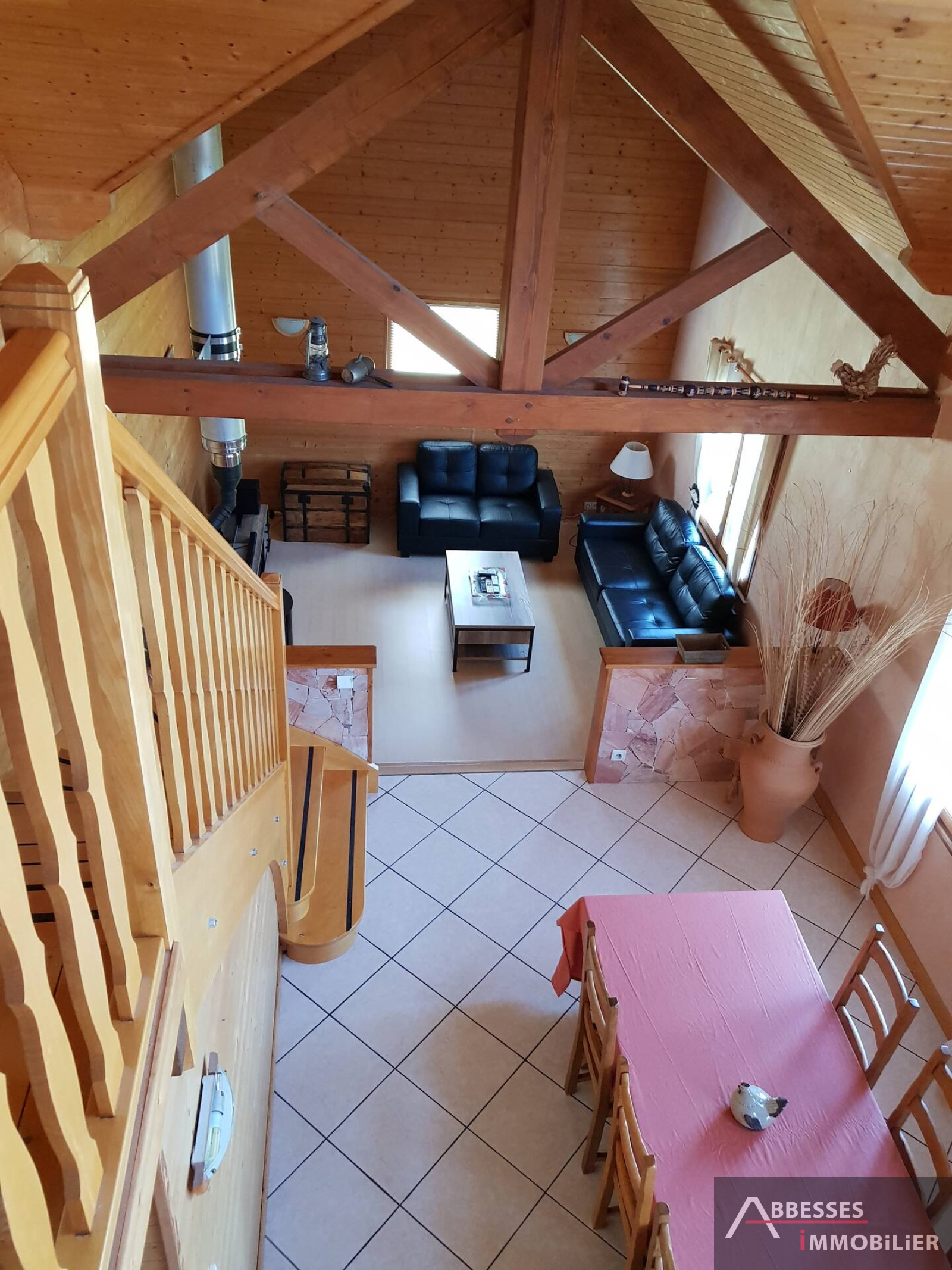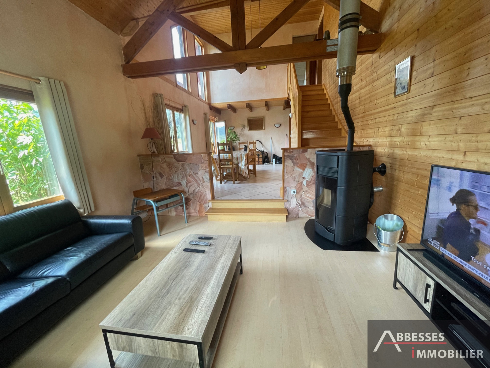 A l'étage : salon-séjour en demi niveau avec poêle à bois et accès balcon, cuisine équipée ouverte sur terrasse, une chambre, salle de bain (douche et baignoire), wc.