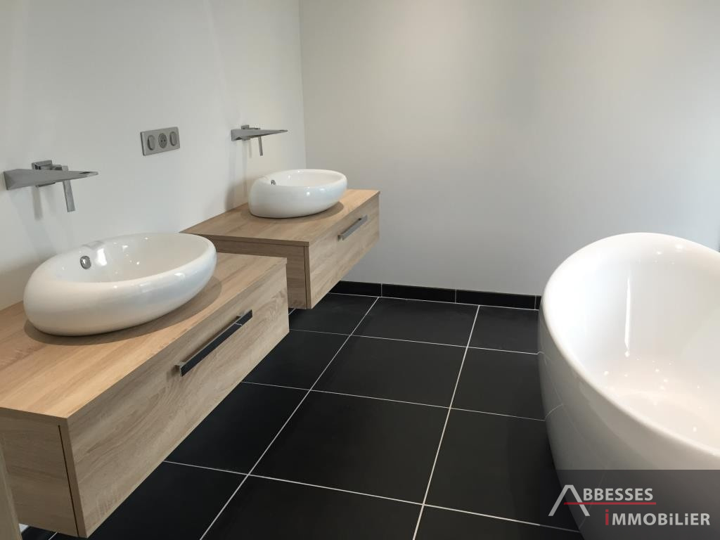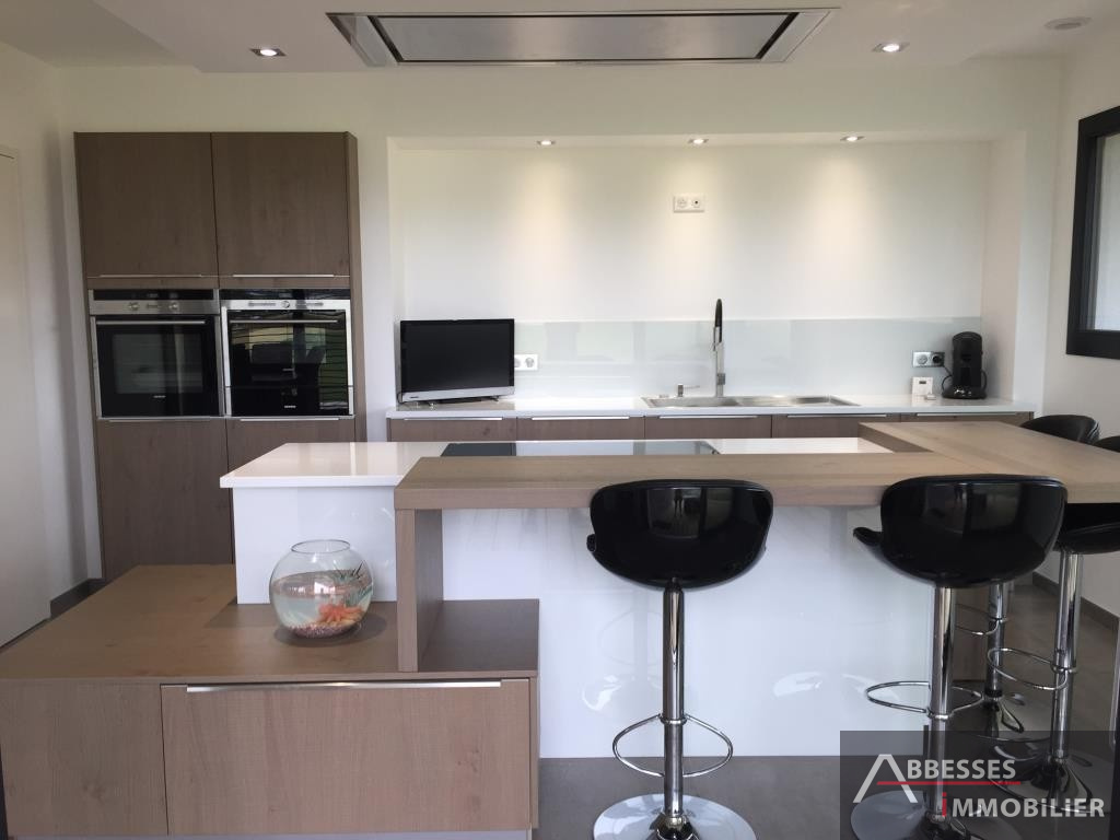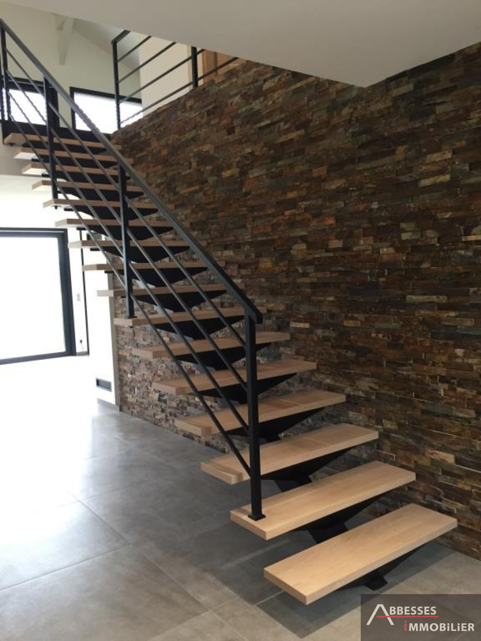 RDC : vaste entrée dégagement, cuisine américaine intégrée (+ cellier) accès terrasse bois, vaste salon-séjour (cheminée) accès terrasse bois, chambre avec partie dressing et salle de bains (baignoire îlot, 2 vasques, douche à l'italienne), wc indépendant, buanderie, garage double avec porte sectionnelle électrique. A l'étage : accès par bel escalier en bois & métal, vaste mezzanine / bureau (possibilité chambre) accès balcon, 2 chambres avec salle de douche italienne, wc indépendant.