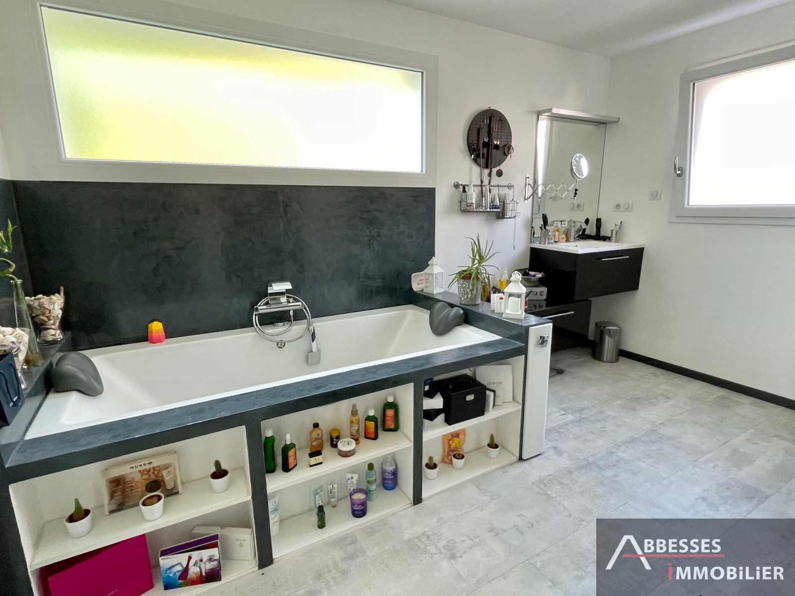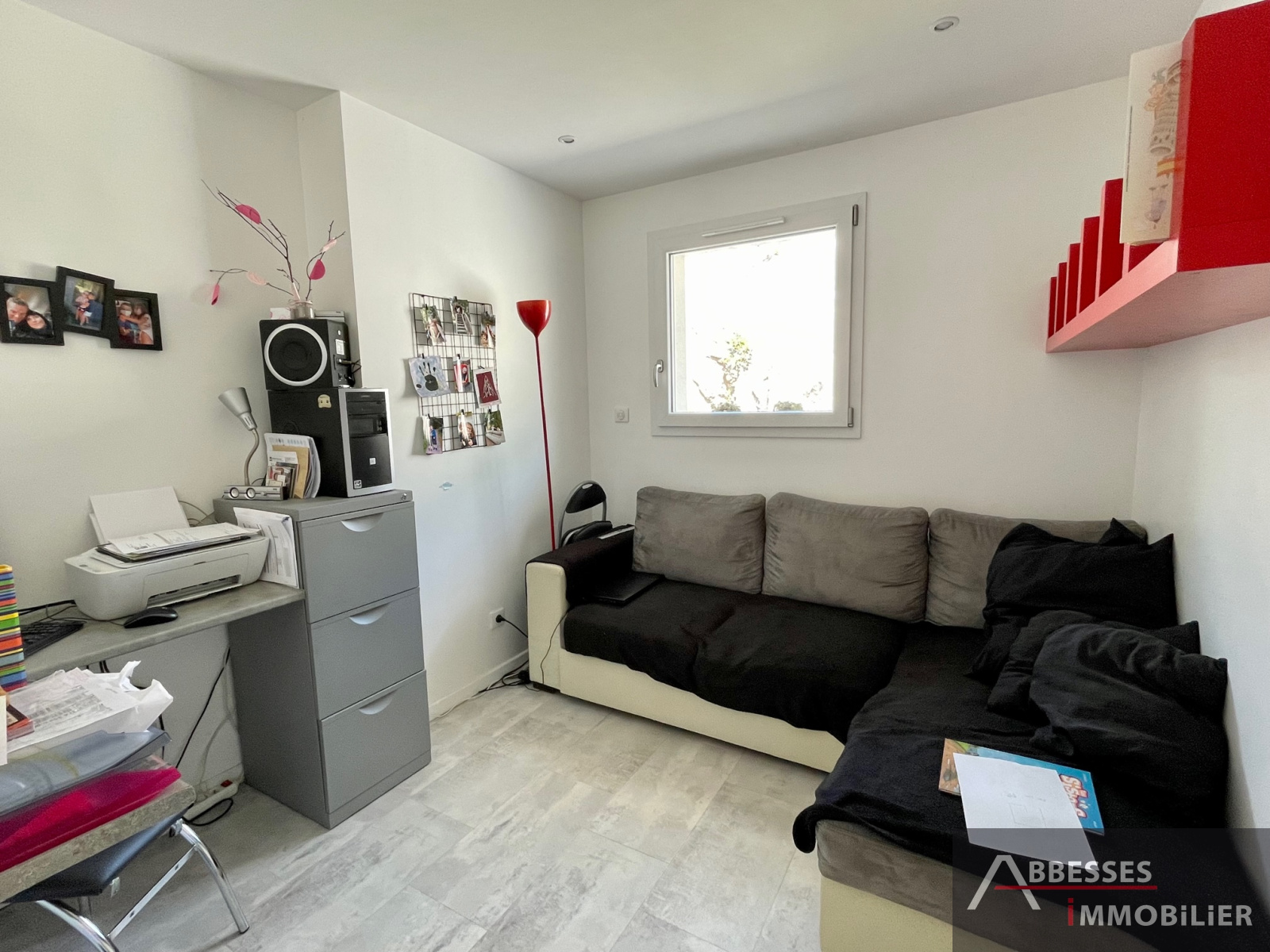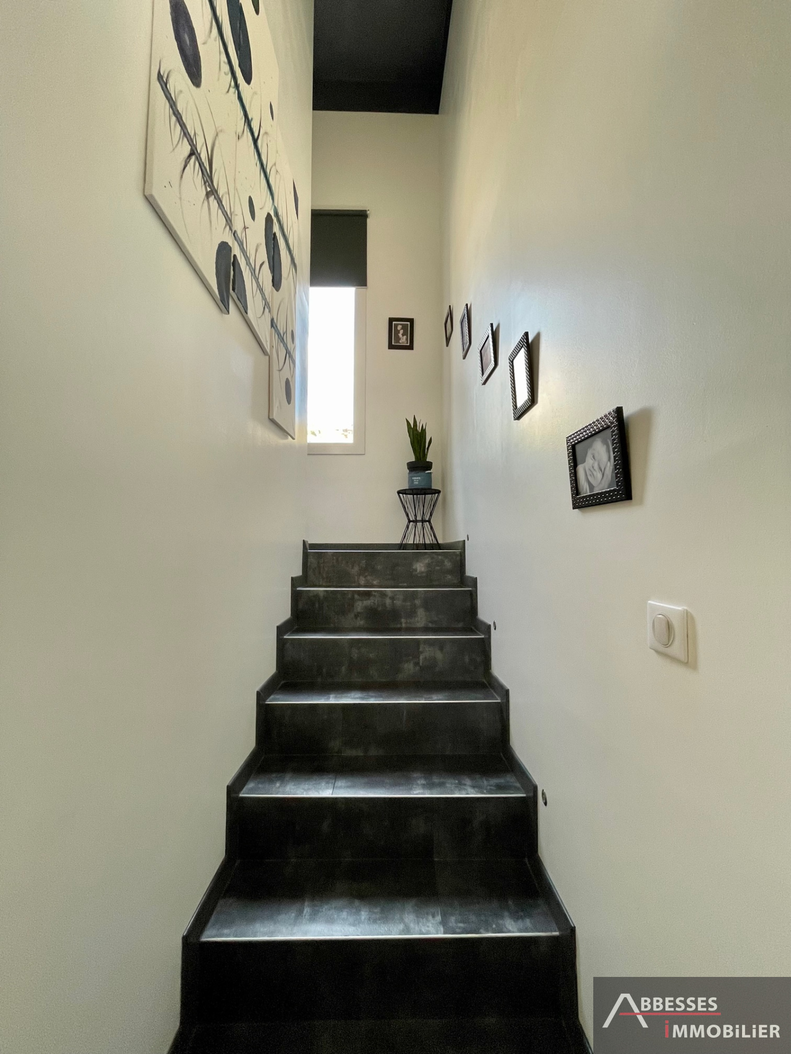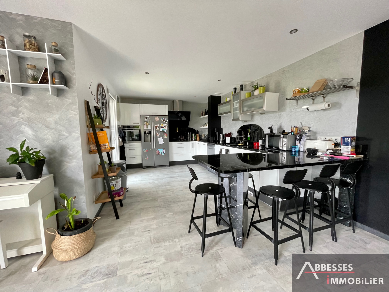 Au rez de chaussée surélevé : entrée avec placard, cuisine équipée avec table bar en granit et donnant accès sur le salon-séjour d'une superficie d'environ 54 m² avec accès extérieur sans vis à vis. Suite parentale d'env 11 m² avec dressing, salle de bains (douche italienne et baignoire). Bureau/chambre (9 m2). Wc indépendant. Buanderie.