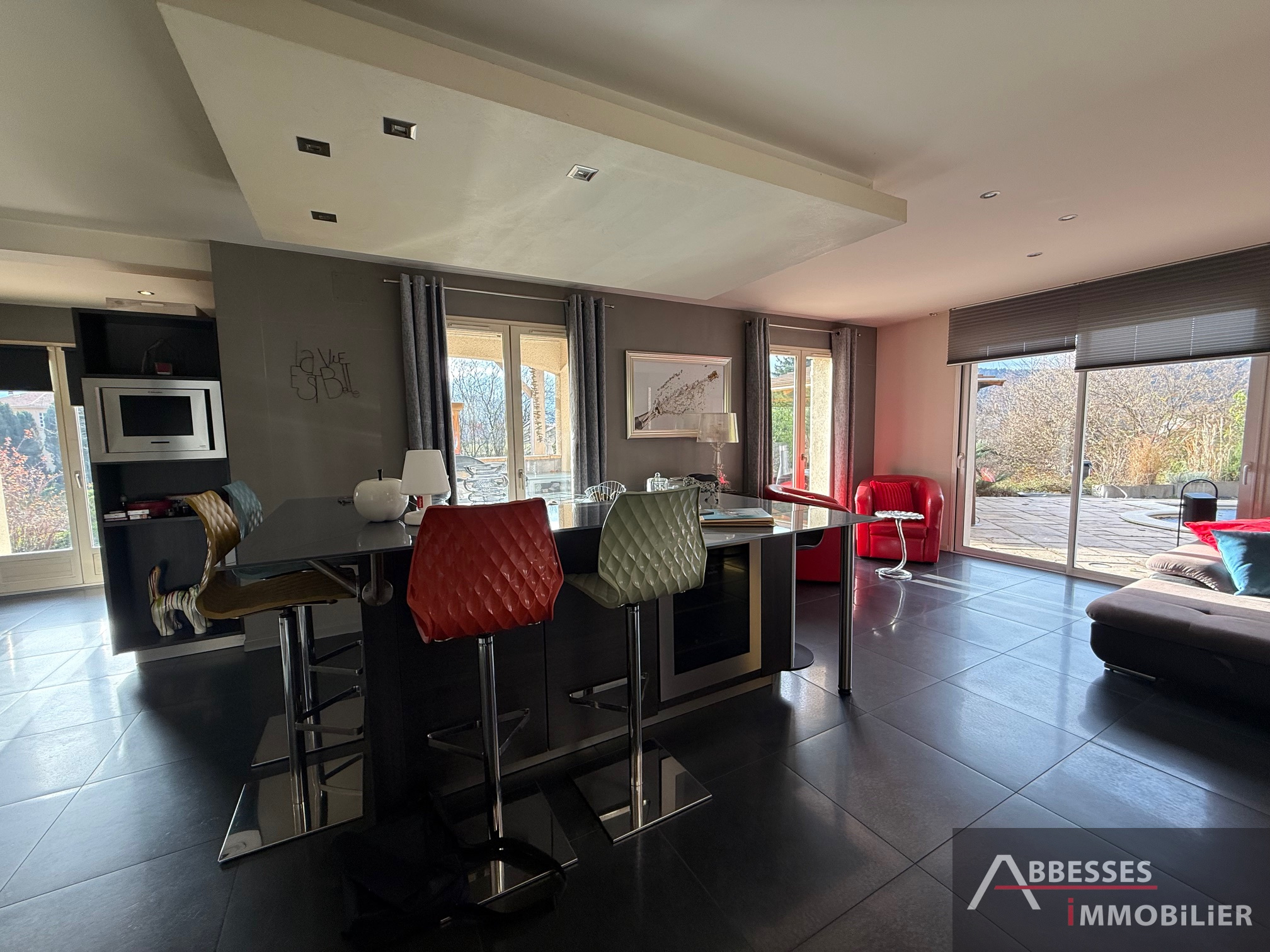 Au rez-de-chaussée : entrée dégagement, grand placard, espace bureau, cuisine équipée intégrée (vendue avec grande table et chaises bar, frigo américain...) ouverte sur salon séjour avec cheminée accès terrasse/piscine et cuisine d'été. WC, salle de douche (douche italienne, 2 vasques).