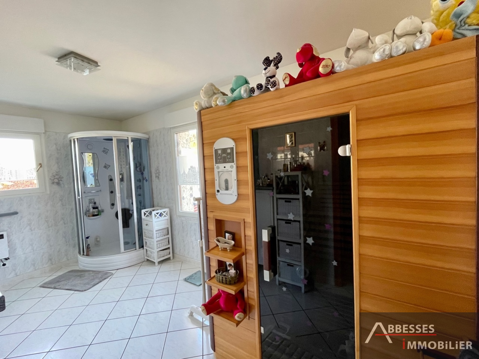 Au 1er niveau : 1 chambre parentale avec dressing, salle de douche avec sauna. Buanderie. Wc